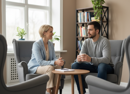 Konsultacja psychologiczna – terapeuta wspiera pacjentkę podczas spotkania w nowoczesnym gabinecie